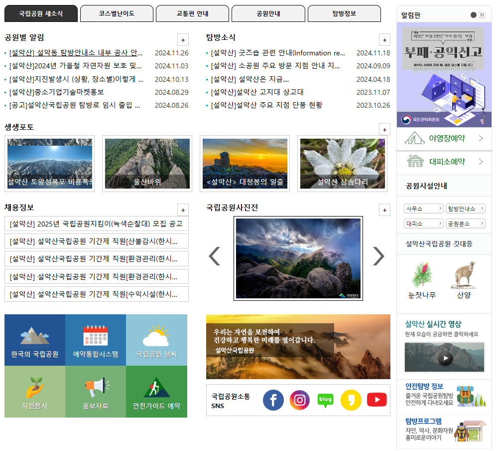 설악산 국립공원 홈페이지 둘러보기