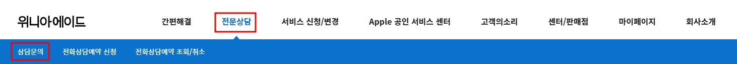 - 상단 메뉴에서 '전문상담'을 클릭하고 '상담문의'를 클릭합니다.