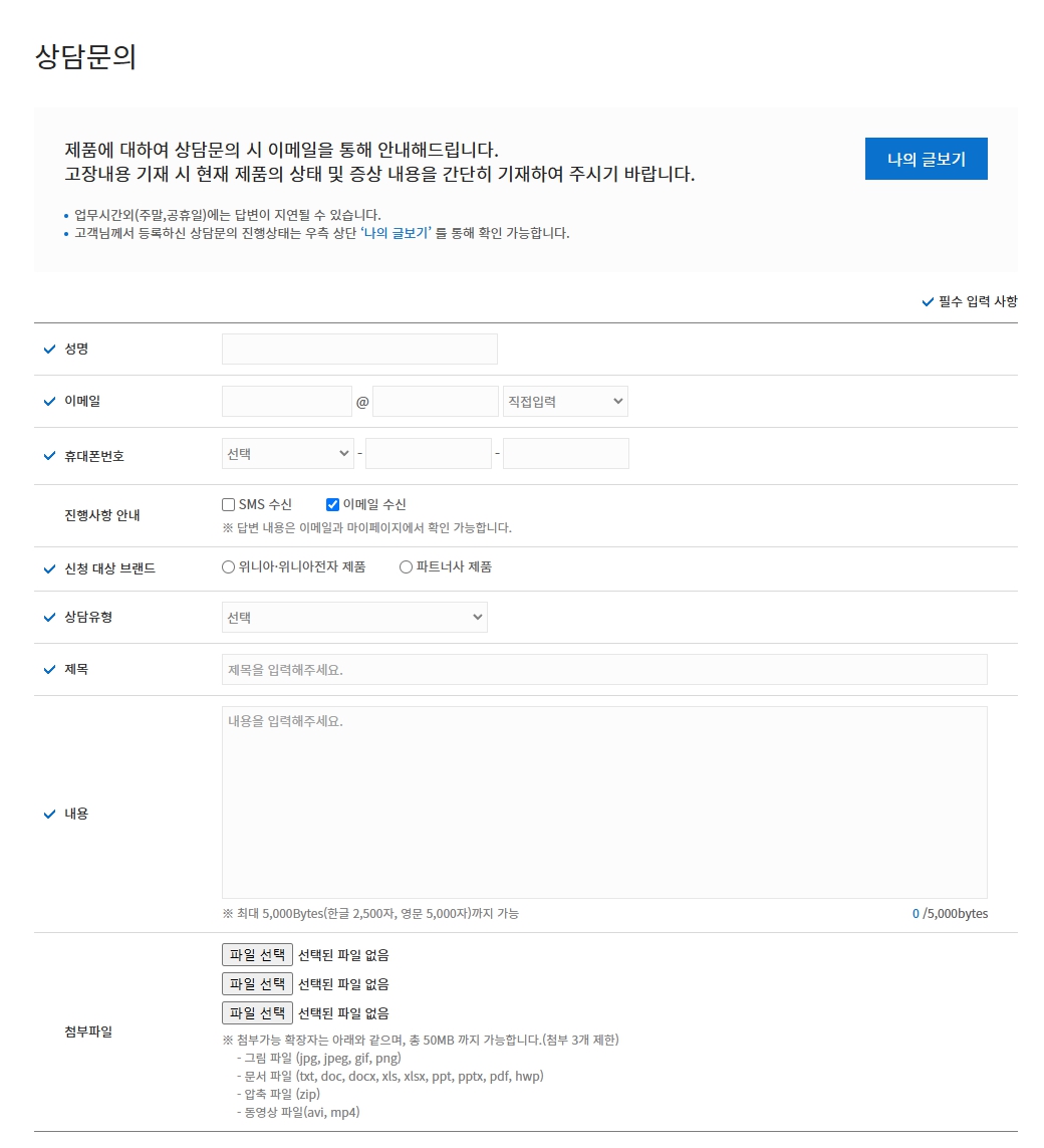 - 성명, 이메일, 휴대폰번호, 상담내용 등에 대한 문의내용을 입력합니다.