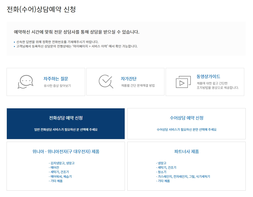 - 전화상담예약, 수어상담예약 중 선택한 뒤, 위니아제품, 파트너사 제품 중 문의할 내용을 선택합니다.