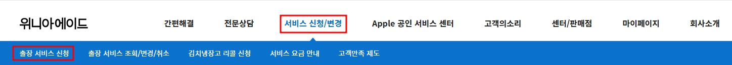 - 상단 메뉴에서 '서비스신청/변경'을 클릭하고 '출장 서비스 신청'을 클릭합니다.