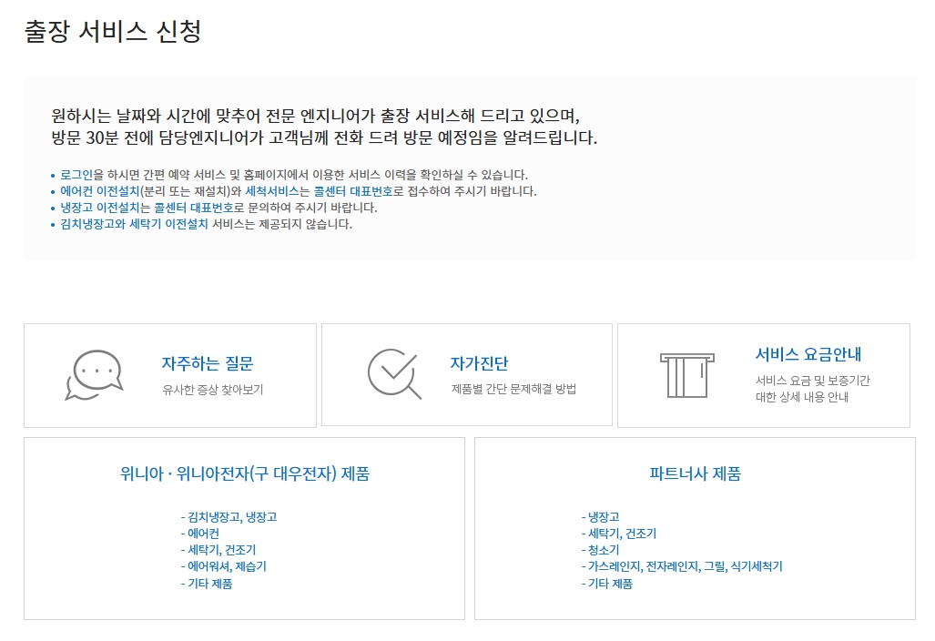 - 출장 서비스: 제품의 크기나 고장 상태에 따라 기술자가 직접 고객의 집을 방문하여 서비스를 제공하는 출장 서비스도 이용 가능합니다.