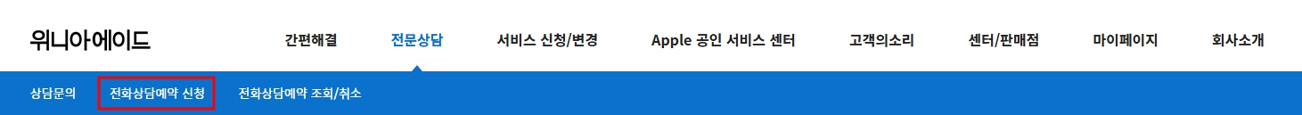 - 상단 메뉴에서 '전문상담'을 클릭하고 '전화상담예약 신청'을 클릭합니다.
