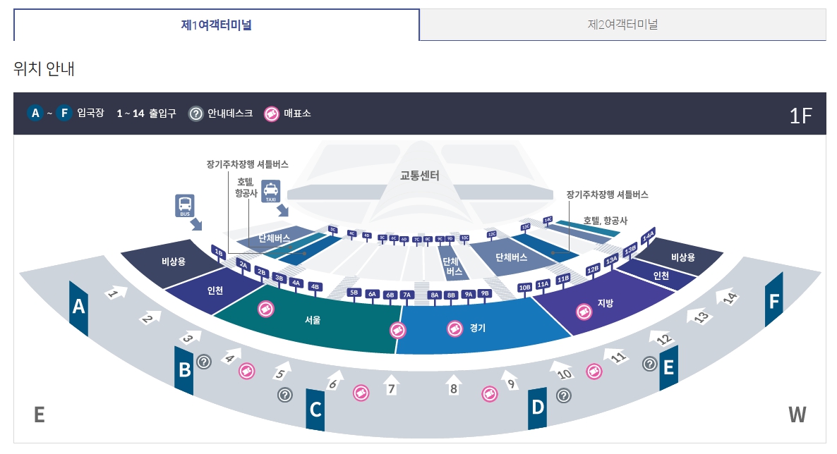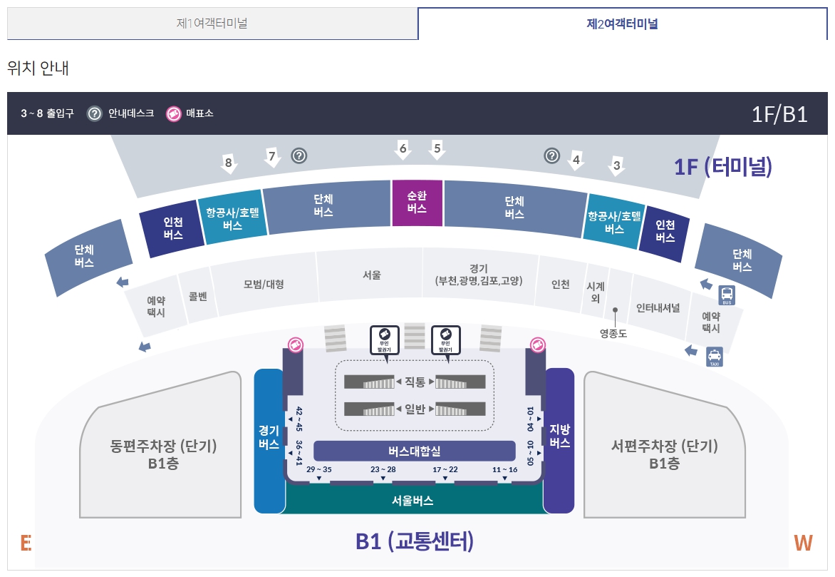 제2여객터미널의 경우, 버스 탑승 위치가 제1여객터미널과는 다릅니다. 정확한 위치는 공항 안내 표지판을 따라가거나 공항 직원에게 문의하는 것이 가장 확실합니다. 일반적으로 출국장을 나와 지상으로 이동한 후 버스 탑승구를 찾아야 합니다.