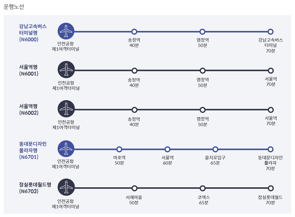 이 노선들은 각각 다른 경로를 통해 서울의 주요 지역을 커버하고 있어, 여행객들의 다양한 목적지를 고려하고 있습니다.